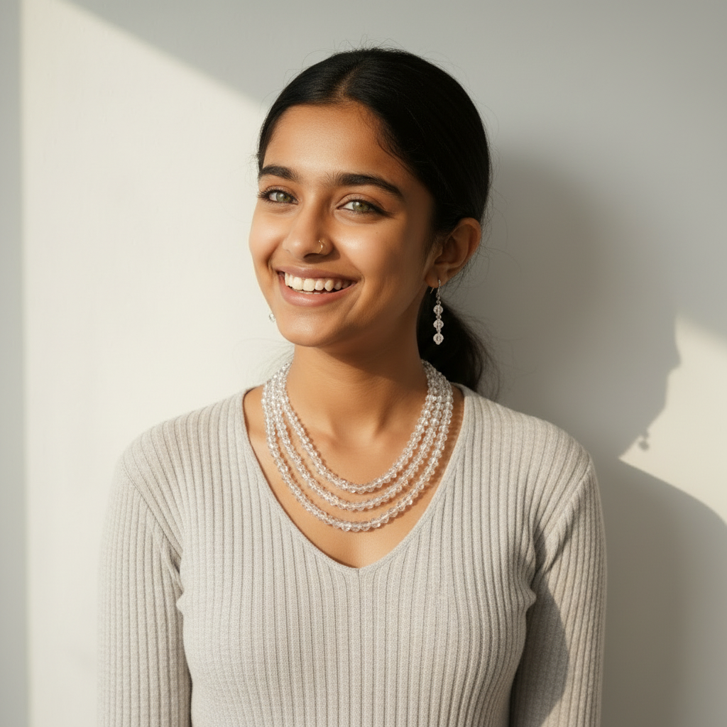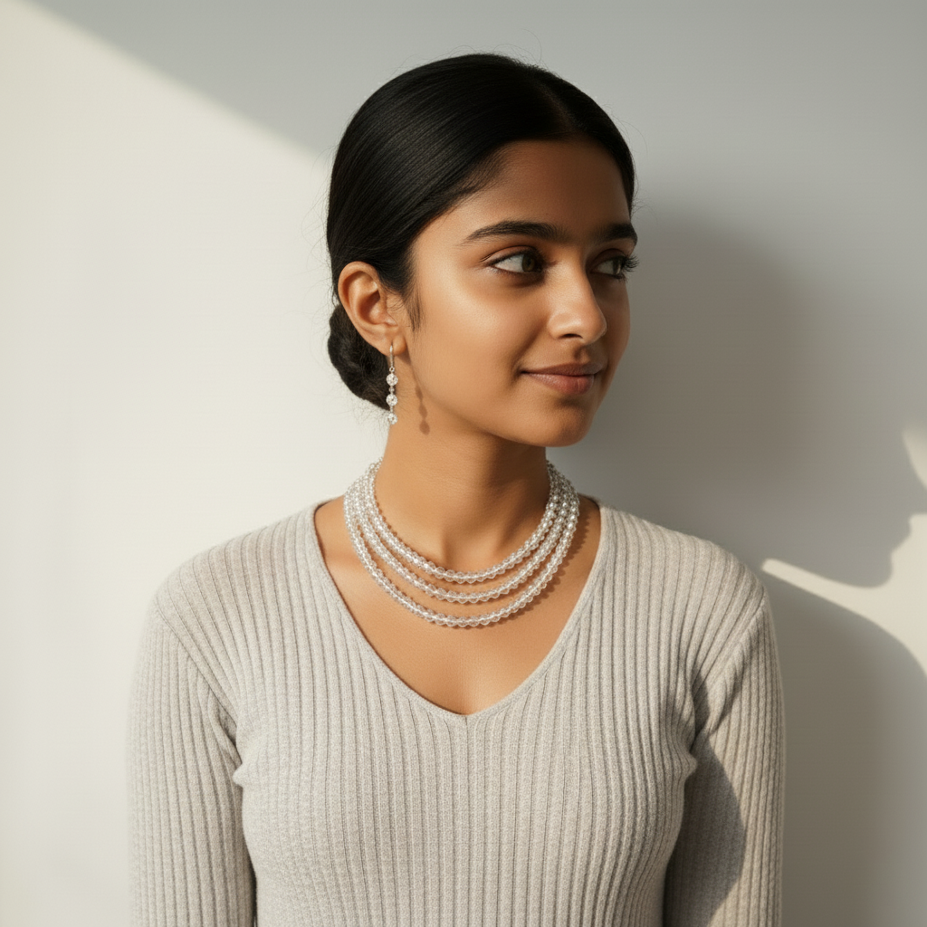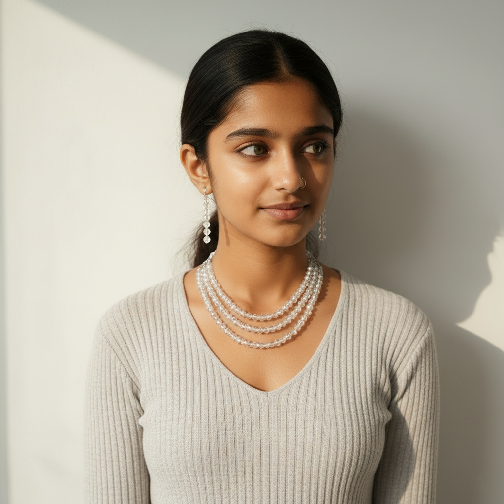 This exquisite jewelry set features a multi-strand necklace and matching drop earrings, crafted from beautifully faceted clear crystal beads. The beads are designed to catch and reflect light, creating a brilliant and eye-catching sparkle.