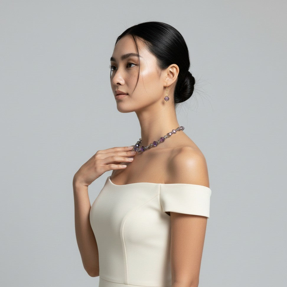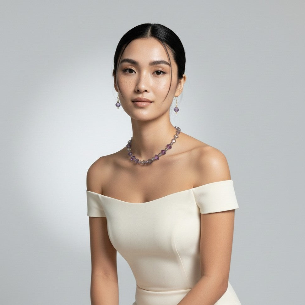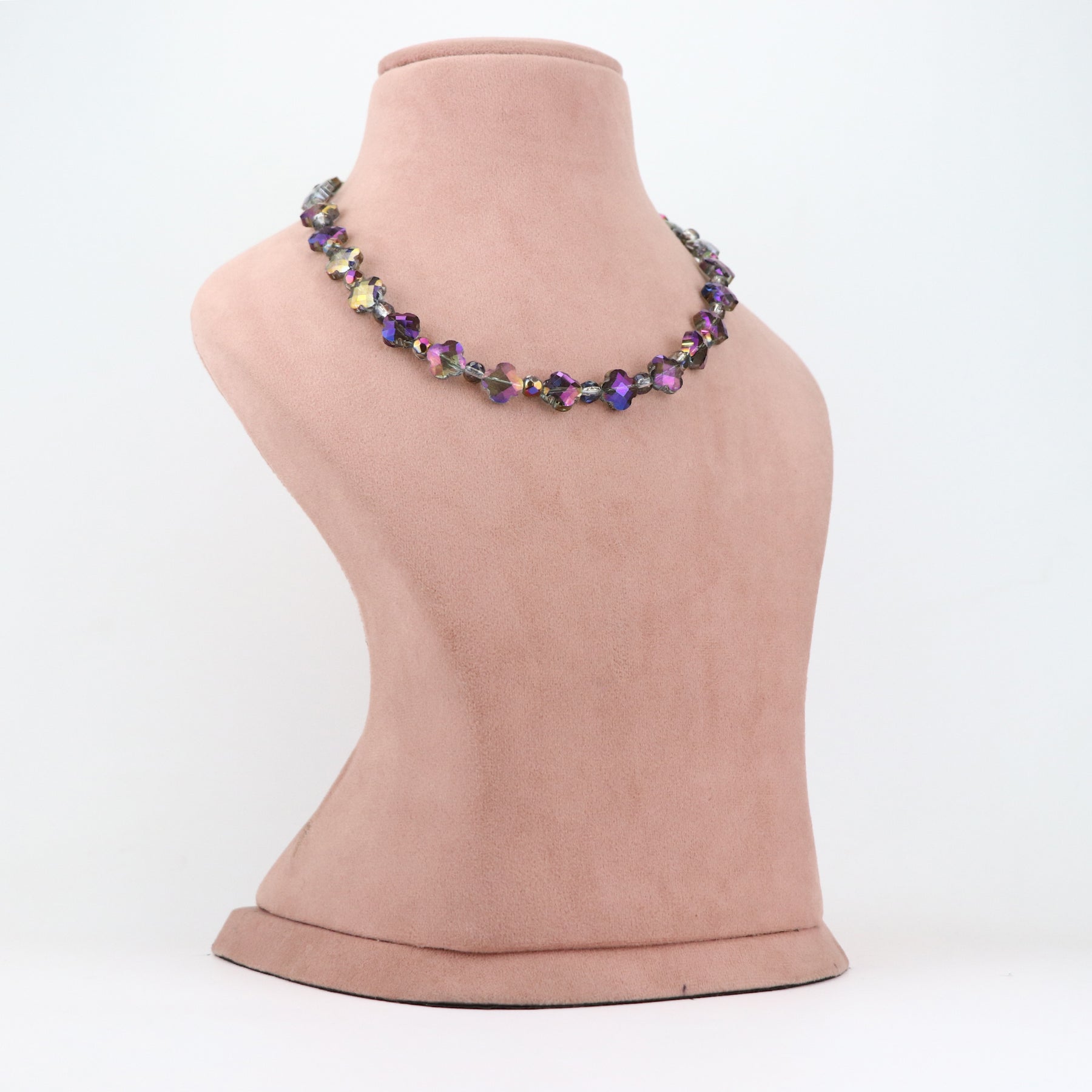 This enchanting jewelry set includes a necklace and a pair of matching drop earrings, both featuring faceted crystal beads with an iridescent coating. The beads display a beautiful array of colors, from purple to hints of blue and gold, depending on the light. The necklace is a choker style that sits elegantly on the neckline.