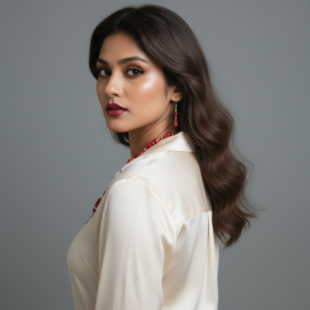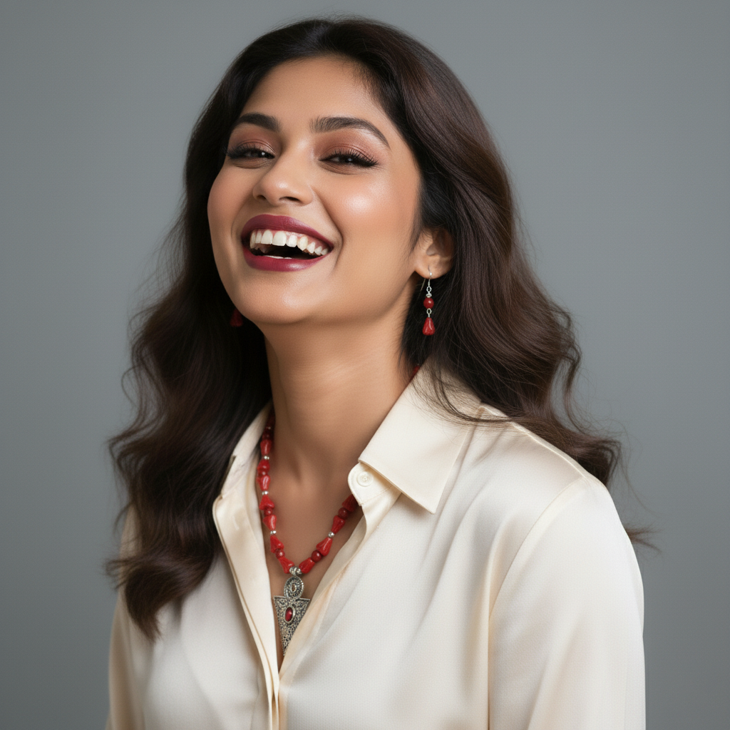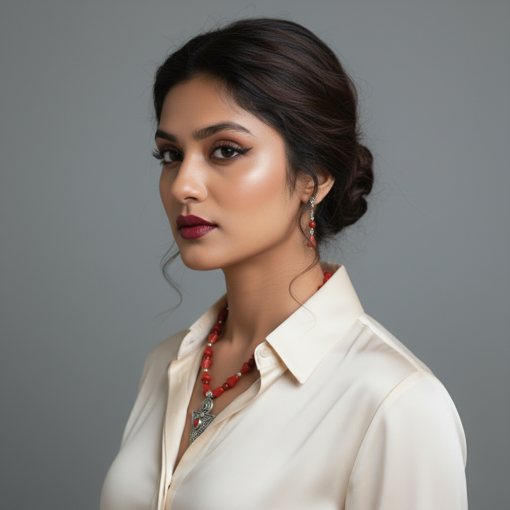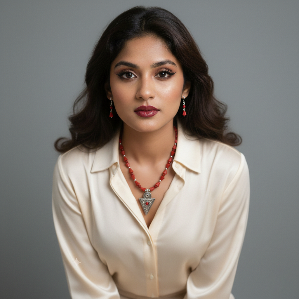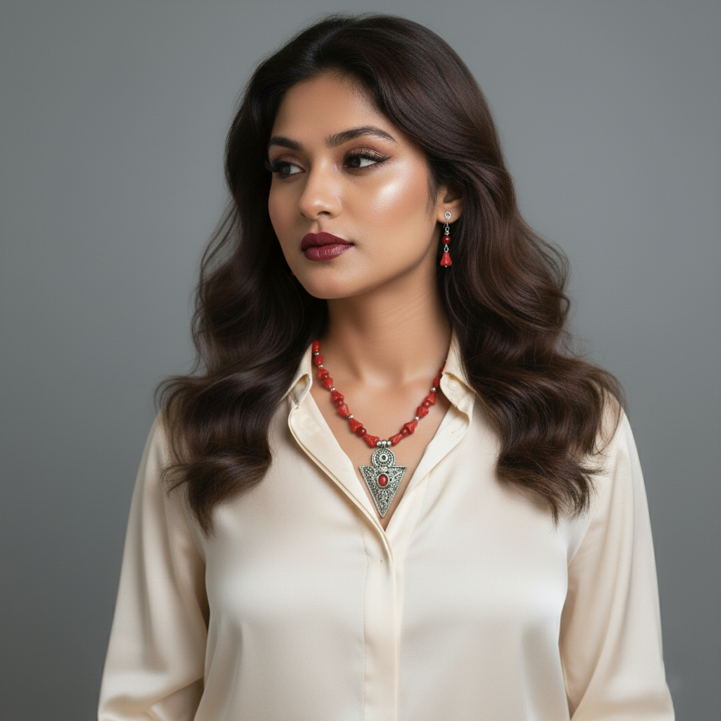 Red Glass Bead Necklace with Oxidized Silver Pendant and Earring Set