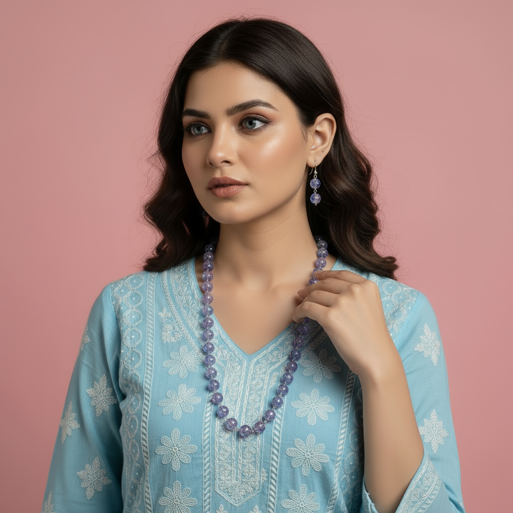 Multi-Strand Purple and Blue Crackled Glass Bead Necklace and Earring Set